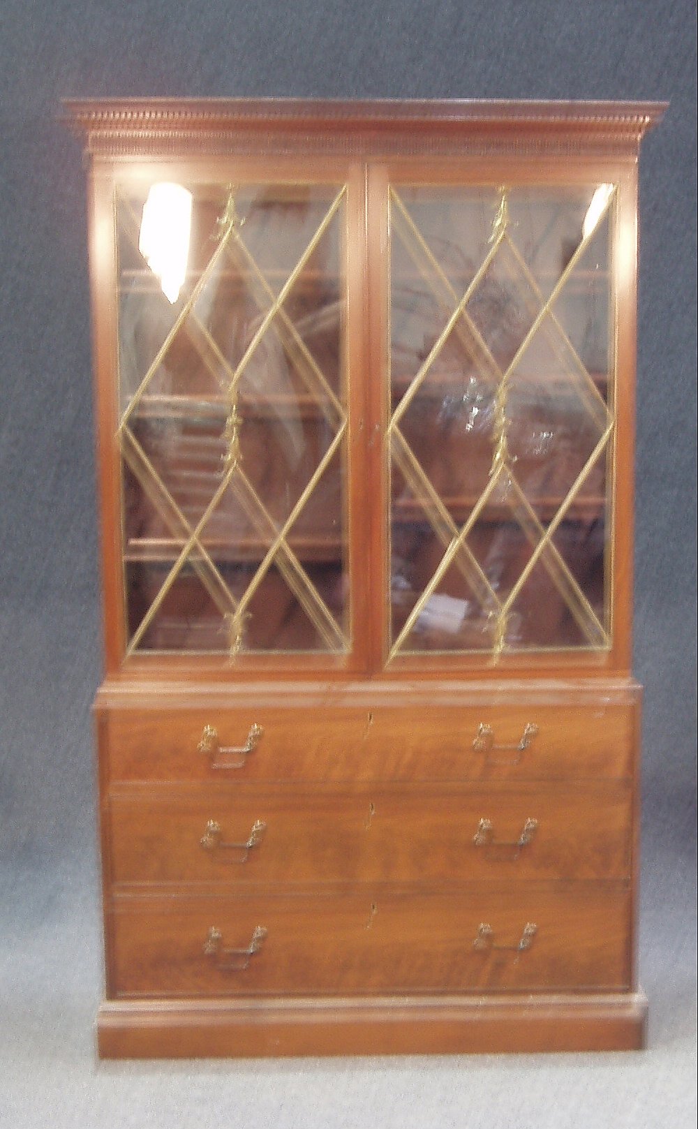 the fluted cornice over two astraglazed doors enclosing adjustable shelves, on rectangular chest, fitted with three graduated drawers on plinth base