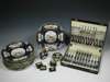 decorated in the Worcester style with pheasants in cartouches reserved against a blue sponged ground and heightened in gilt; six similar circular pin dishes; six matching vesta boxes; and a boxed set of cutlery decorated in a matching pattern (qty)