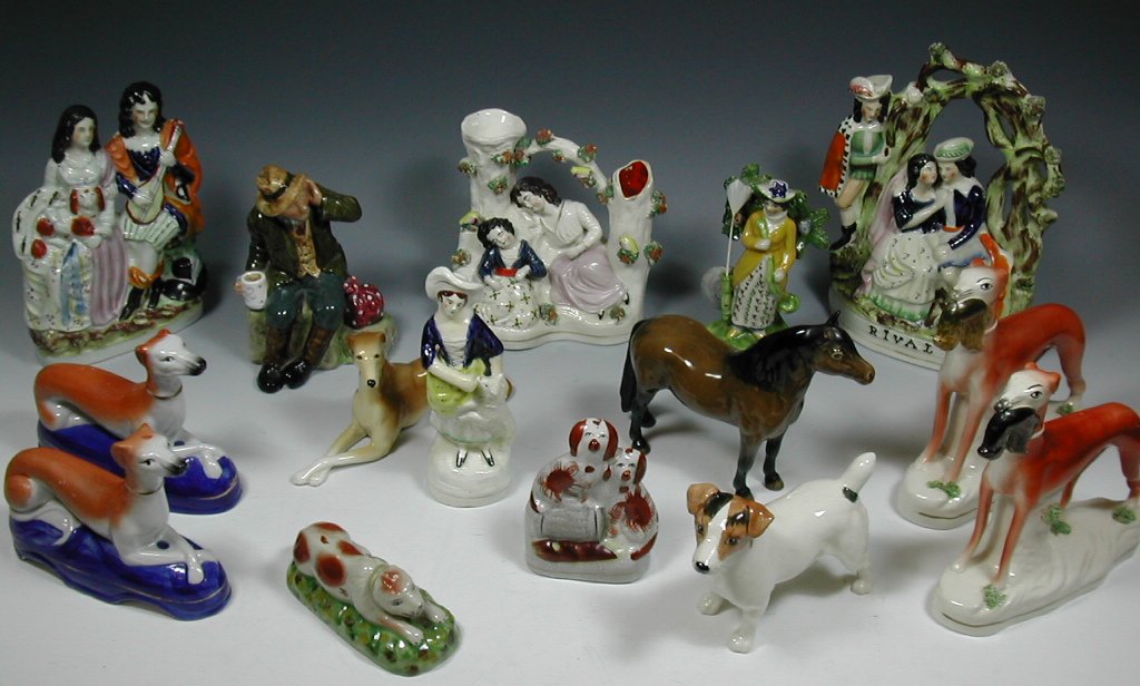 HN2042; a Staffordshire spill vase depicting two sleeping girls in a bower; a Staffordshire figure group of a couple, he with a guitar, she with a dog; a Staffordshire figure group "Rival"; a matched pair of standing greyhounds; a pair of seated greyhounds; two figures of ladies; four figures of dogs; and a figure of a horse (15)