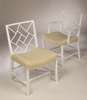 by Whytock & Reid, Edinburgh, including two open armchairs, overpainted in white, each with pierced lattice back above dished and upholstered seat on clustered front legs linked by stretchers (6)
