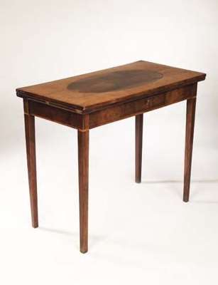 the rectangular hinged top with oval panel inlay enclosing a baize interior, above single drawer on square tapering legs