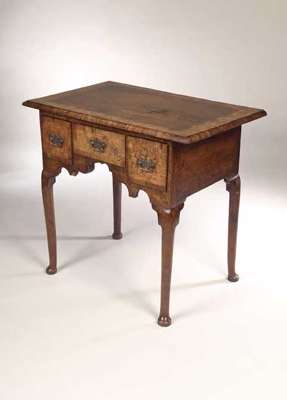 the moulded rectangular top with wide burrwood crossbanding and later veneering, above three short drawers over shaped frieze, on stained turned tapering legs with pad feet (alterations)