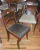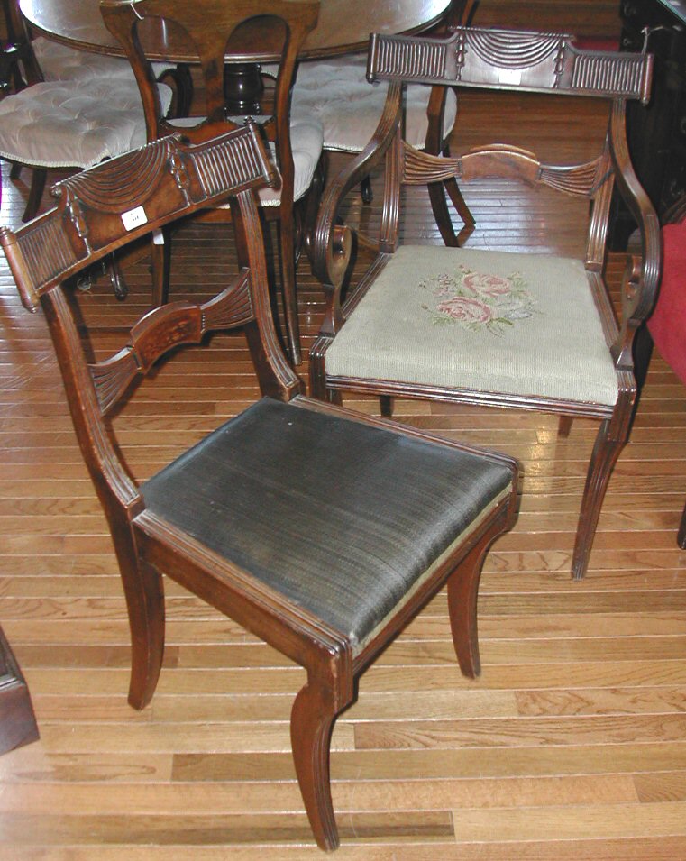 each with reeded toprail with carved swag tablet and scroll edges, above a reeded mid-rail and a drop-in seat and reeded sabre legs (7)