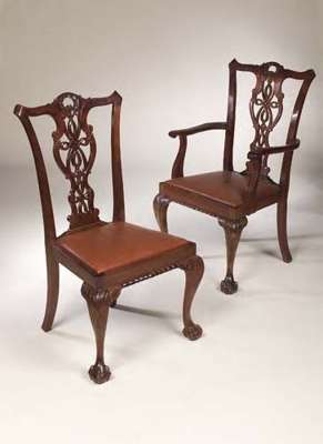 including four open armchairs, each in the mid 18th century style with carved serpentine top rails above elaborately pierced vase splats and drop-in seats raised above leaf carved front cabriole legs terminating in ball and claw feet (16)