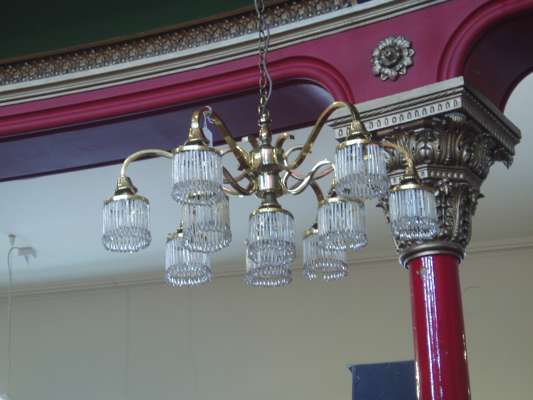 each composed of six S-scroll branches terminating in circular framed lights suspending faceted cylindrical and briolette cut glass drops (2)