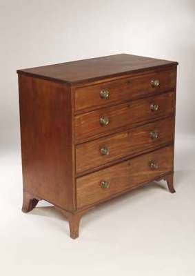 the top with reeded edge above four long graduated drawers, on splayed bracket feet