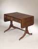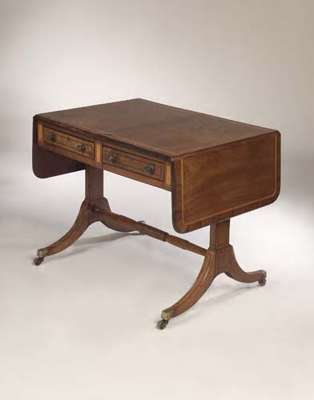 the rectangular top with rounded angles and moulded edge above two drawers, each with ebony lines, opposed by two dummy drawers, the whole raised on rectangular section supports with sabre legs, linked by a ring turned stretcher and terminating in brass caps and castors