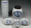 with pierced wood stand; also a pair of circular shallow bowls; and a tall character painted cylindrical vase, ALSO INCLUDES A SMALL BLUE AND WHITE BOWL (5)