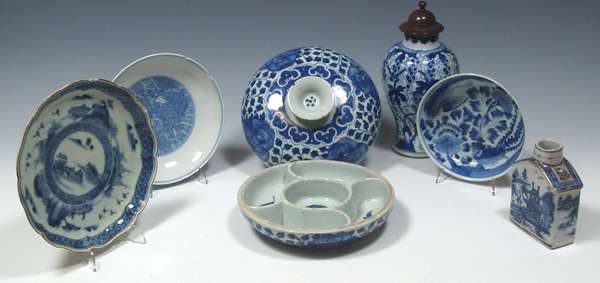 including a shallow dish with scalloped edge, the central panel painted with landscape, reserved against further landscapes; a vase and cover ; a flask of rectangular shaped form; and a cylindrical vase with pierced hardwood cover (qty)