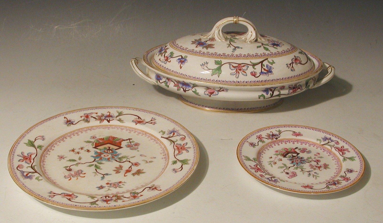 to include; three graduated ashets; two tureens and covers; a quantity of dinner plates, side plates, soup bowls and saucers. [qty]
