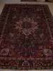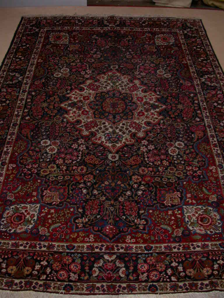the indigo field with central ivory and blue medallion suspending pendants, red spandrels, within indigo floral vine border between ivory bands