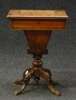 the hinged top inlaid with specimen wood and opening to reveal fitted interior, on baluster column with carved cabriole legs and drop finial,