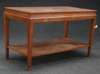 the rectangular top with ebonised inlay , on square cut tapering legs joined by an undershelf