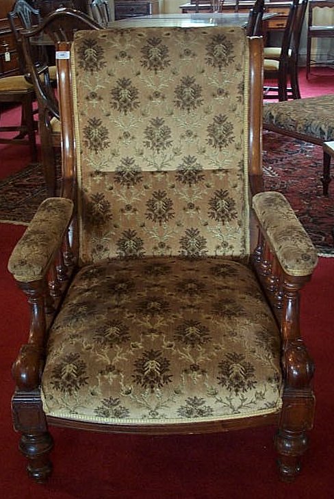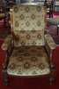 with button upholstery and spindle filled arms