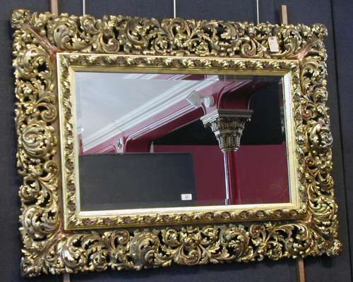 of rectangular outline, the later bevelled plate enclosed by an elaborately carved and pierced foliate frame with applied later gilding and with copper highlighting to the angles