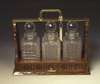 with brass carry handle above floral carved ends, the sliding shelf fitted with three square section cut glass decanters and stoppers, with label for Mappin & Webb