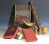 a bell metal mortar and pestle; a collection of boxwood pill boxes and labels; and a collection of eighteen various pharmaceutical books (qty)