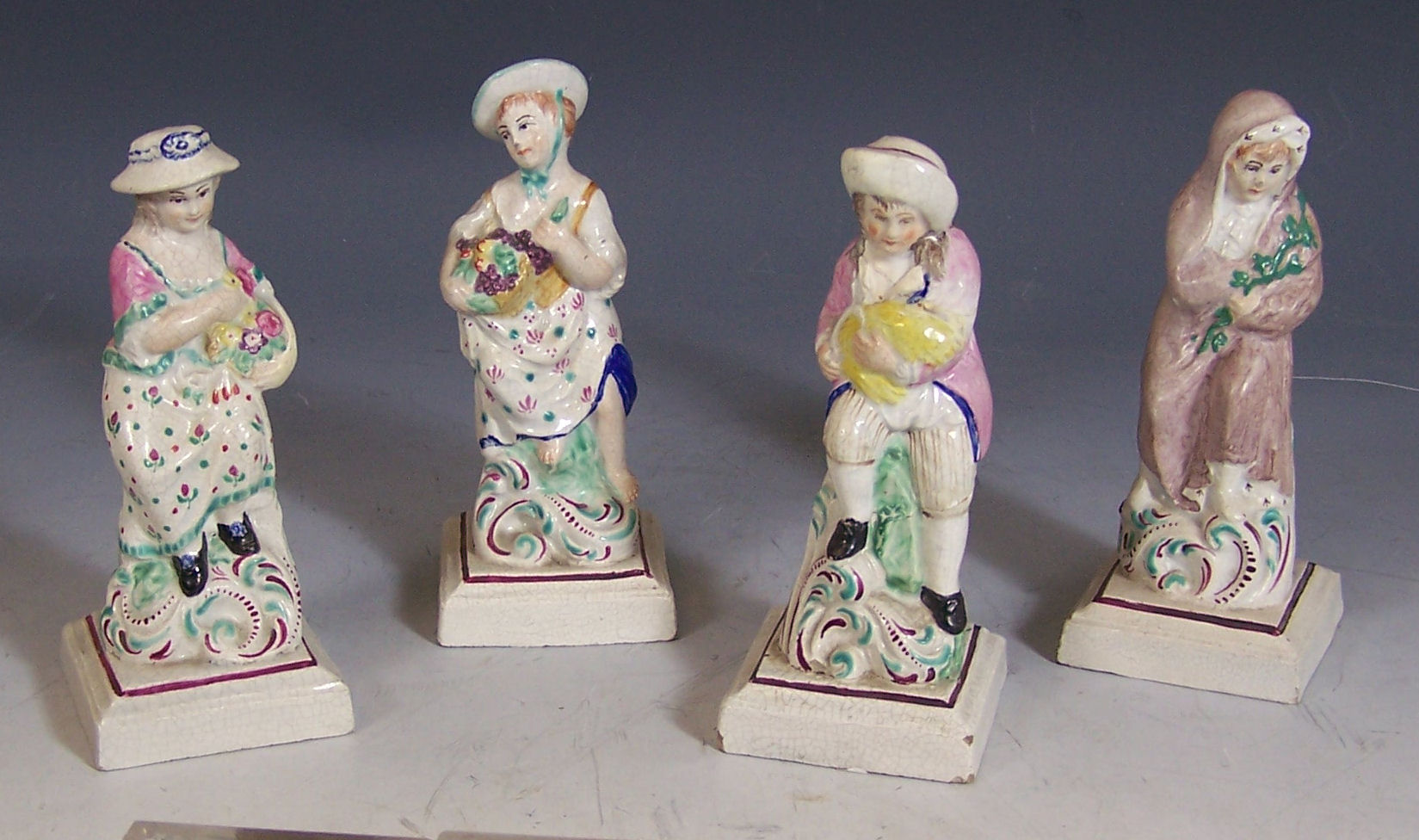 each with scroll base on maroon line decorated plinth, Spring and Autumn with baskets of flowers and grapes respectively, each with impressed season mark on the underside (4)