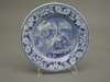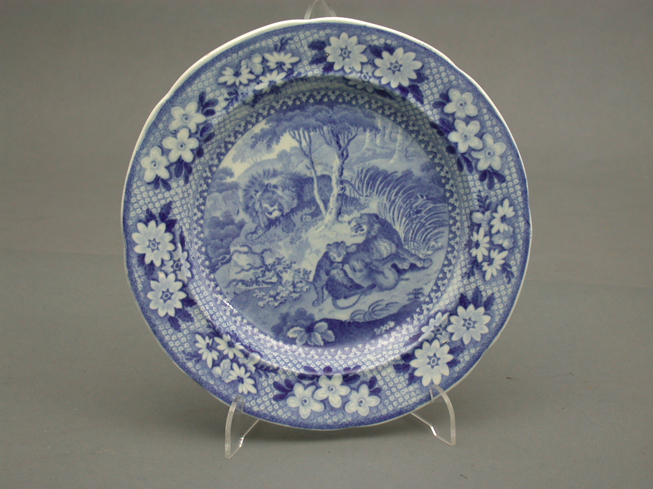 of wedge form, with floral and trellis border, impressed mark, 29cm wide; an early 19th century 'The Font' pattern hors d'oeuvres dish and cover, Thomas Rathbone & Co, of curved wedge shape, with a shell form scroll handle, painted mark, 34cm wide; an early 19th century 'Lions' pattern blue printed dessert plate, Adams, with a floral border, impressed mark, 22.5cm diameter; and an early 19th century 'Fallow Deer' pattern blue printed ashet, John Rogers & Sons, of canted rectangular form, within a floral border, impressed mark, 48cm diameter (4)