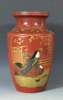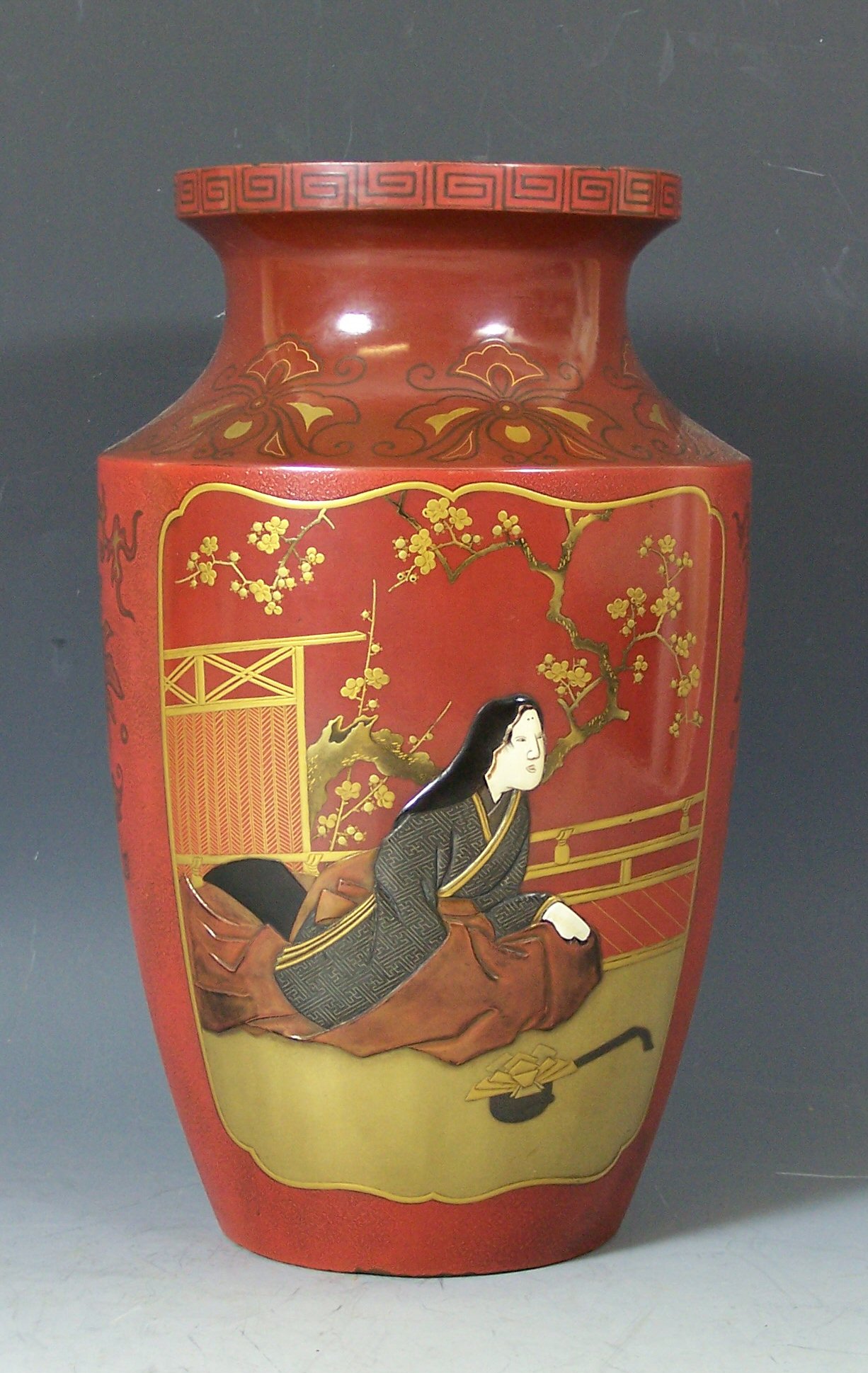 with opposed panels, one inlaid with a seated lady, the other with flowers, on a red enamel ground inlaid with stylised foliate designs