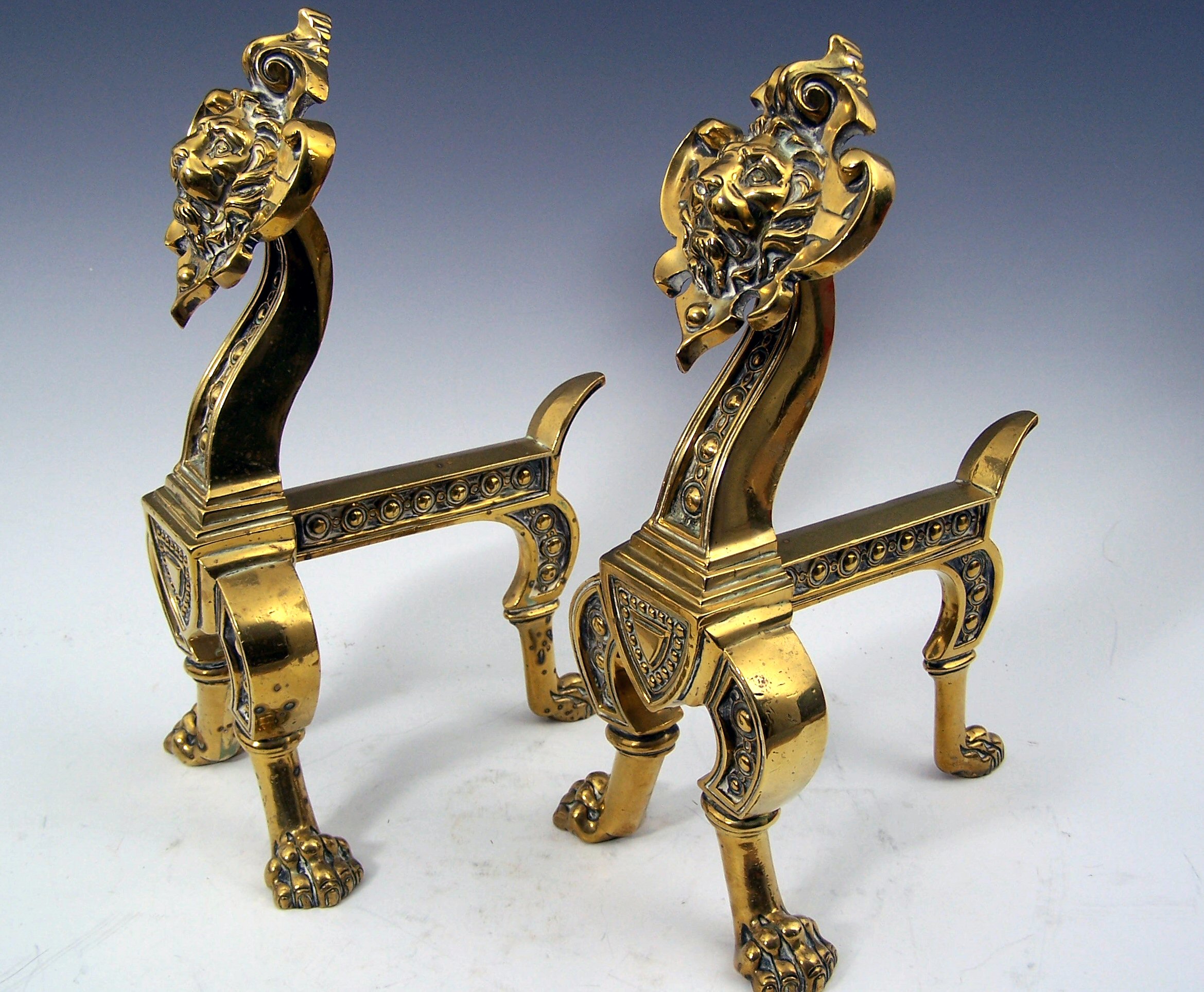 each with lion mask finials, on splayed paw feet; a set of three Georgian brass fire irons, with ball finials; and a small pair of Art Nouveau style coal tongs (6)