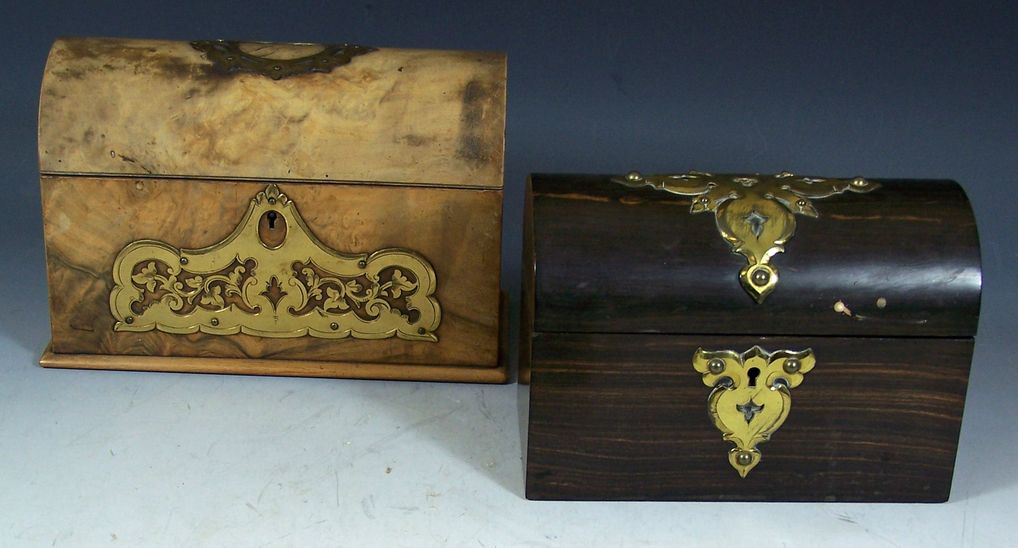 A Victorian coromandel and brass mounted dome topped stationery box,