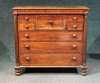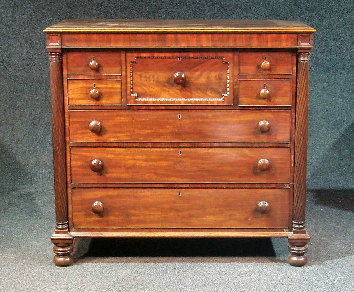 with moulded rectangular top above frieze drawer and an arrangement of five short drawers, above three graduated long drawers, flanked either side by turned columns, on bun feet