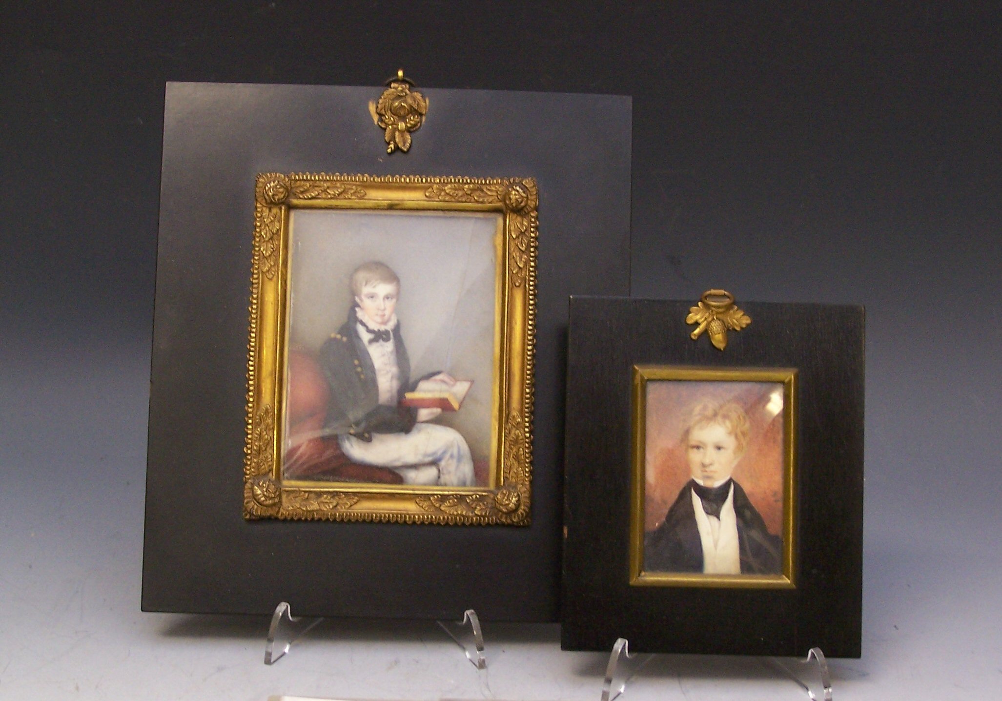 of a boy reading book, in a rectangular ebonised and brass mounted frame, 11cm x 8cm; and another bust length, of a young man, in an ebonised and gilt mounted frame, 7cm x 5cm (2)