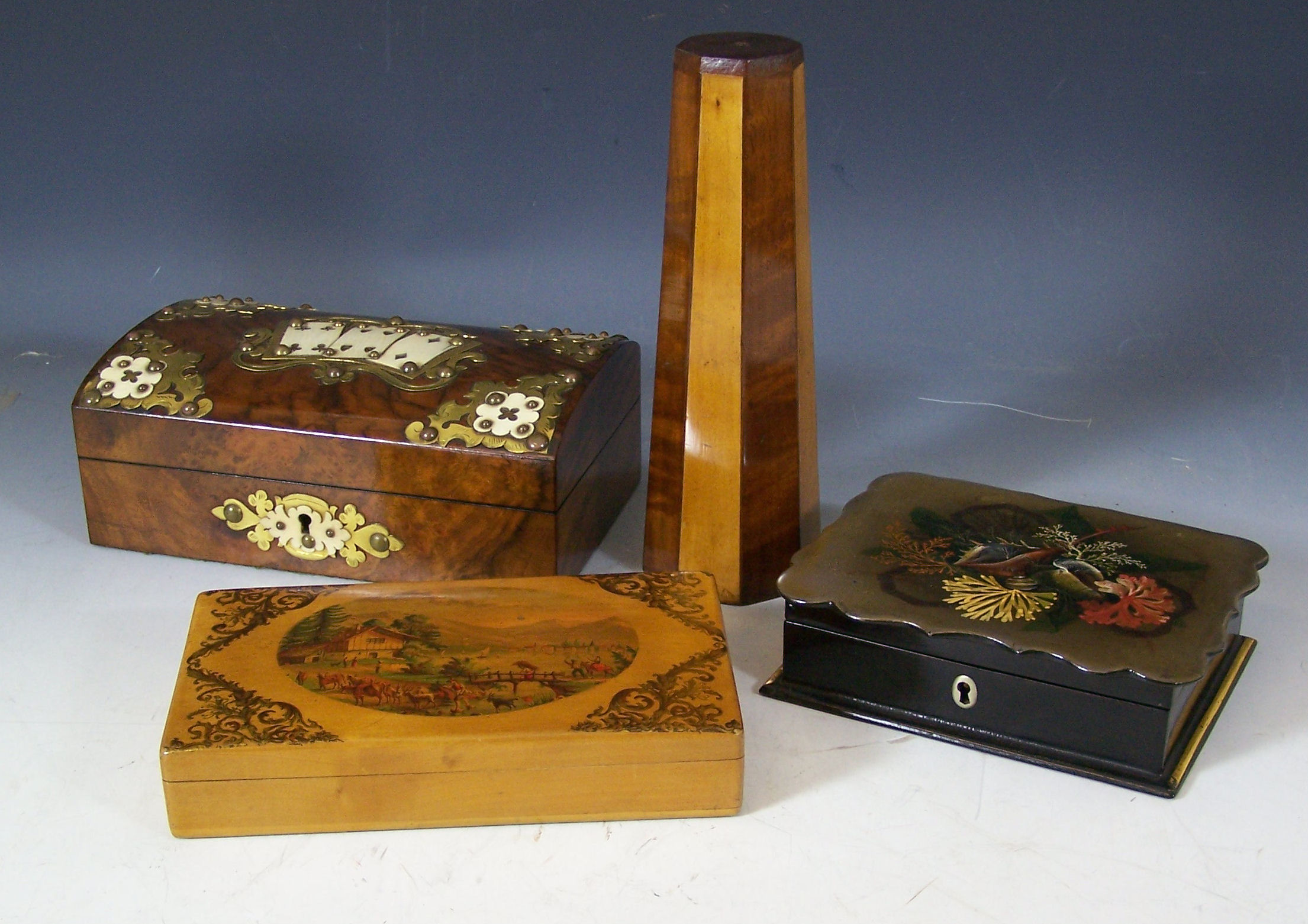 together with a domed walnut card box, applied cut brass work; a lacquer and papier mache card box; and a continental birch games box with gilt and transfer decoration, each with cards and counters (qty)
