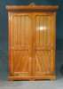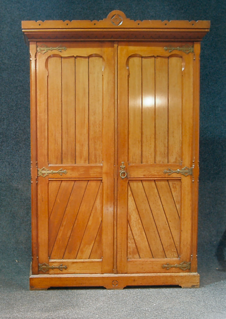 with a shaped moulded cornice over two panelled doors with strap hinges, enclosing a fitted interior, on plinth base