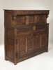 the rectangular top above an overhanging carved frieze with pendants, above two panelled doors, the base with twin drawer above two doors, each profusely carved and with inscription 'EH1674', the whole raised on stile supports, basically 17th century with later carving and alterations