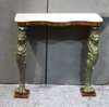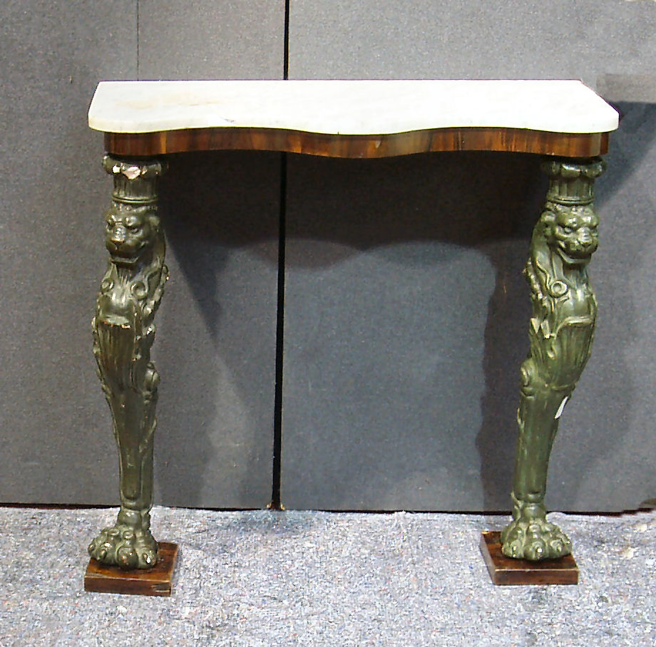 with a marble top over a rosewood frieze, on lion masked patinated composite consoles with claw feet