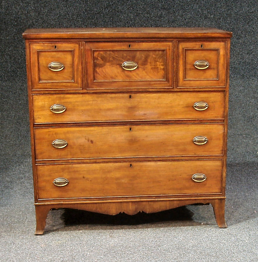 with three deep panelled drawers over three graduated long drawers above shaped apron, on splayed feet