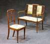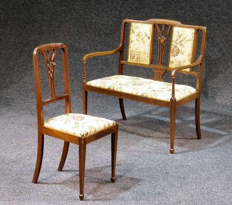 including a two seater sofa with interlaced vertical splat, flanked either side by cushioned panels, with outstretched arms on turned supports, over a cushioned seat, on square tapering legs and spade feet, 96cm wide; an open armchair; and three side chairs (5)