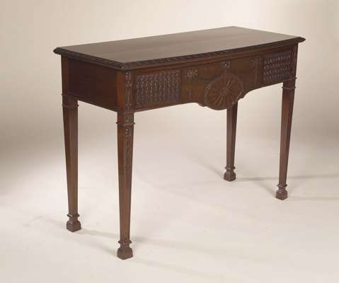 of Adam style, the top with leaf carved edge above three relief carved drawers, the centre drawer with ribbon tied swags suspending oval pattern, on panelled square section legs, with husk drops and short feet