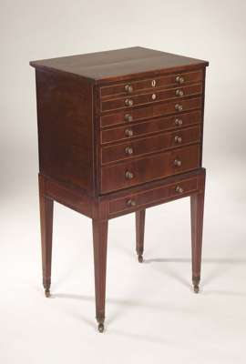 with boxwood and chequer stringing, the hinged top inset with oval panel enclosing lift-out tray, inlaid to the interior birds eye maple panel, above five graduated drawers, raised on stand with false drawer, on square section tapering legs, brass caps and casters