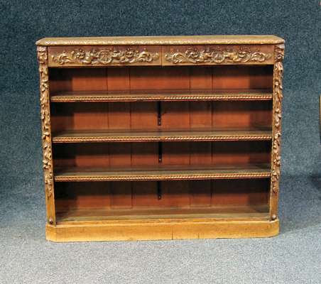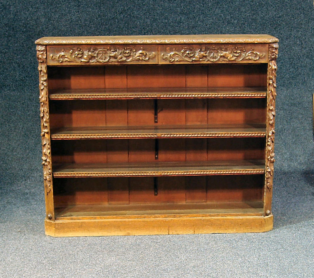 the carved top above two boldly carved frieze drawers, carved Greenman capped canted corners, on stepped plinth base