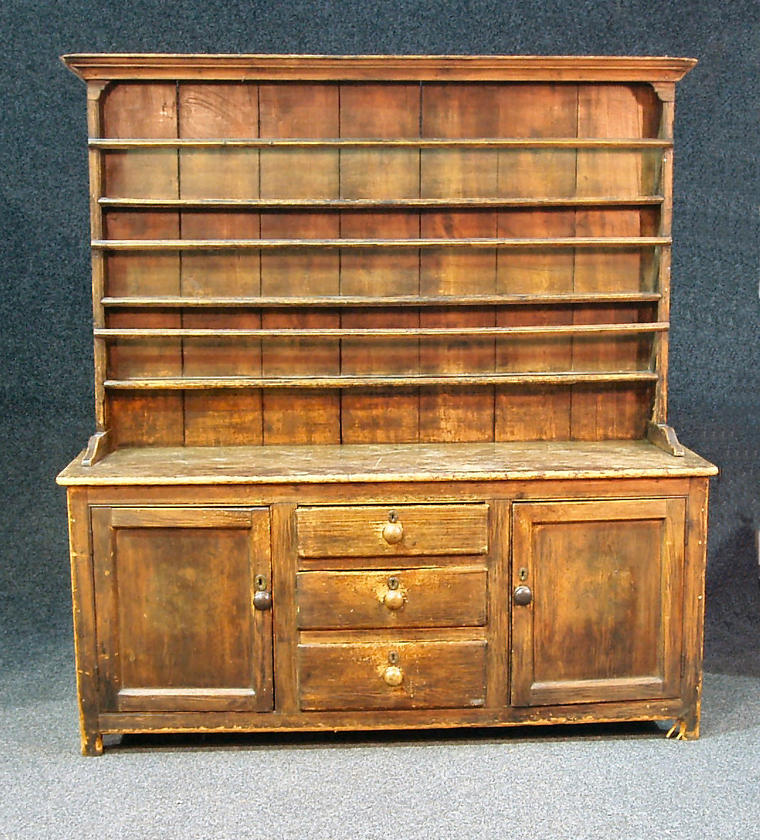 with moulded cornice over three shelves, above a rectangular top over three graduated drawers, flanked on either side by cupboards, on block feet