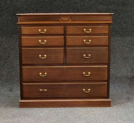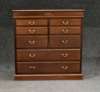with moulded rectangular hinged lid enclosing a clothes press , Patent Reg. 469090, above two banks of three graduated short drawers over two long drawers, on plinth base