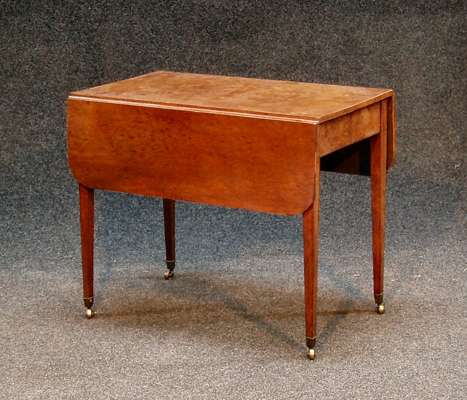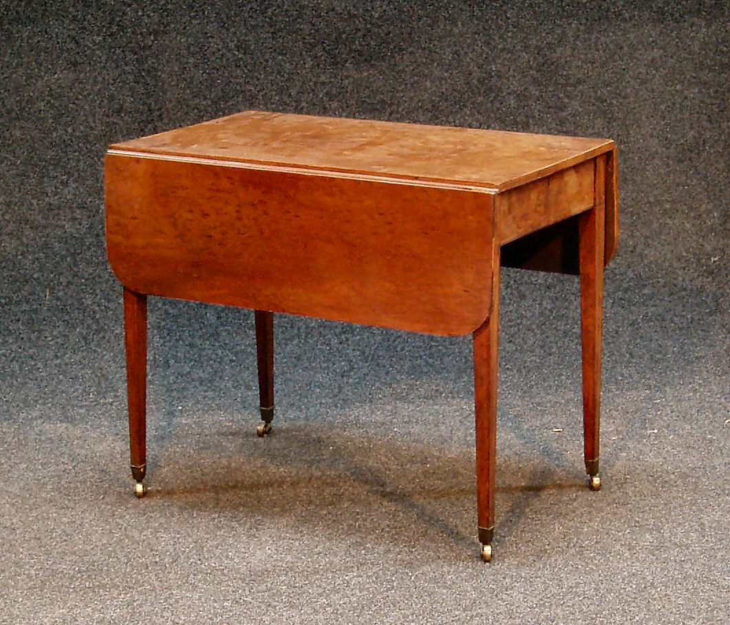 the rectangular twin flap top with rounded angles,boxwood stringing, above a single frieze drawer, on square tapering legs with brass caps and castors