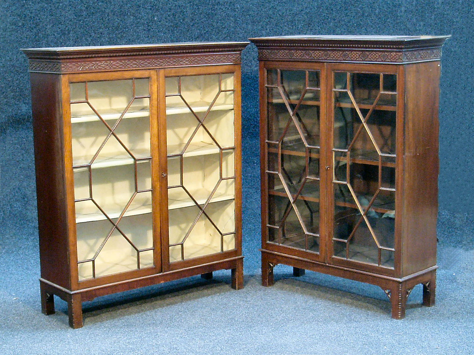 each with rectangular moulded dentil cornice over two astragal glazed doors enclosing three adjustable shelves, on bracket feet (2)