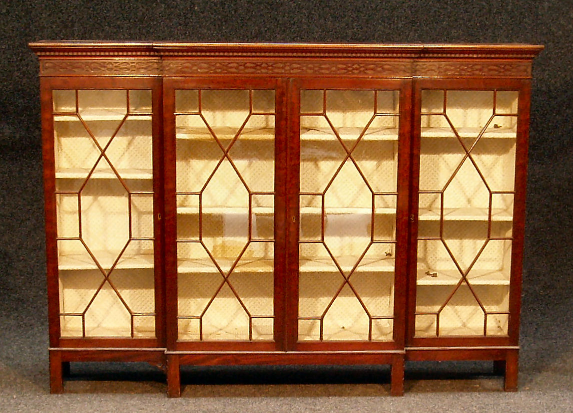 with moulded dentil cornice above two central astragal glazed doors, flanked on either side by a further two, enclosing three adjustable shelves, on bracket feet