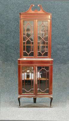 with swan neck pediment above tablet frieze, over two astragal glazed doors, the projecting lower section with two astragal glazed doors, shaped skirt, on cabriole legs with pad feet