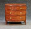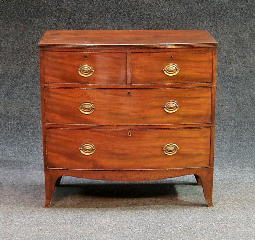 with a moulded D-shaped top above two short and two long drawers, shaped apron, on splayed bracket feet