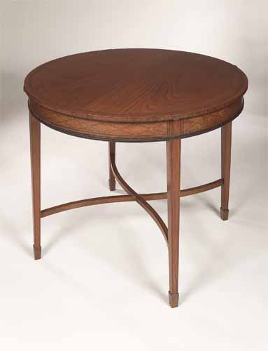 the circular top with ebony and boxwood stringing and lozenge and rosette inlaid frieze, raised on square tapering legs linked by curved stretchers and terminating in spade feet