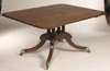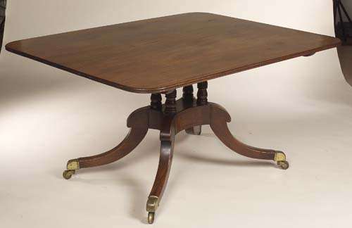 the rectangular tilt top with rounded angles and reeded edge, raised on pedestal base with four turned columns and four sabre legs with ebony stringing, brass caps and castors