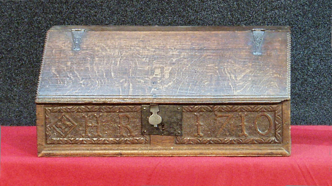 with hinged sloping top, the frieze carved with the initials 'H.R.' and the date 1710, on a moulded plinth base