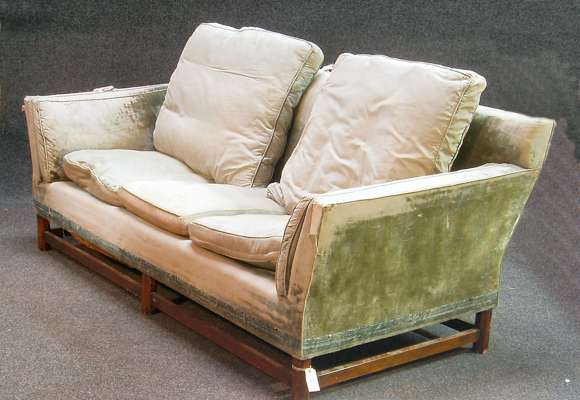 upholstered in green velvet with loose cushions, on octagonal legs united by stretchers