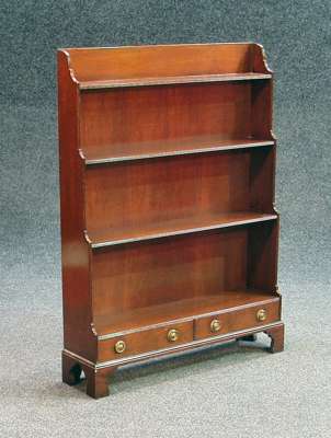 with moulded three quarter gallery over four open shelves, above two short frieze drawers, on bracket feet