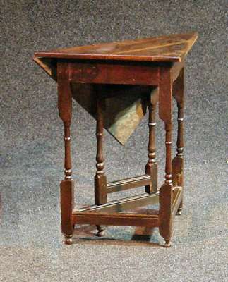 the triangular top with matching flap, on block and turned legs, united by plain stretchers